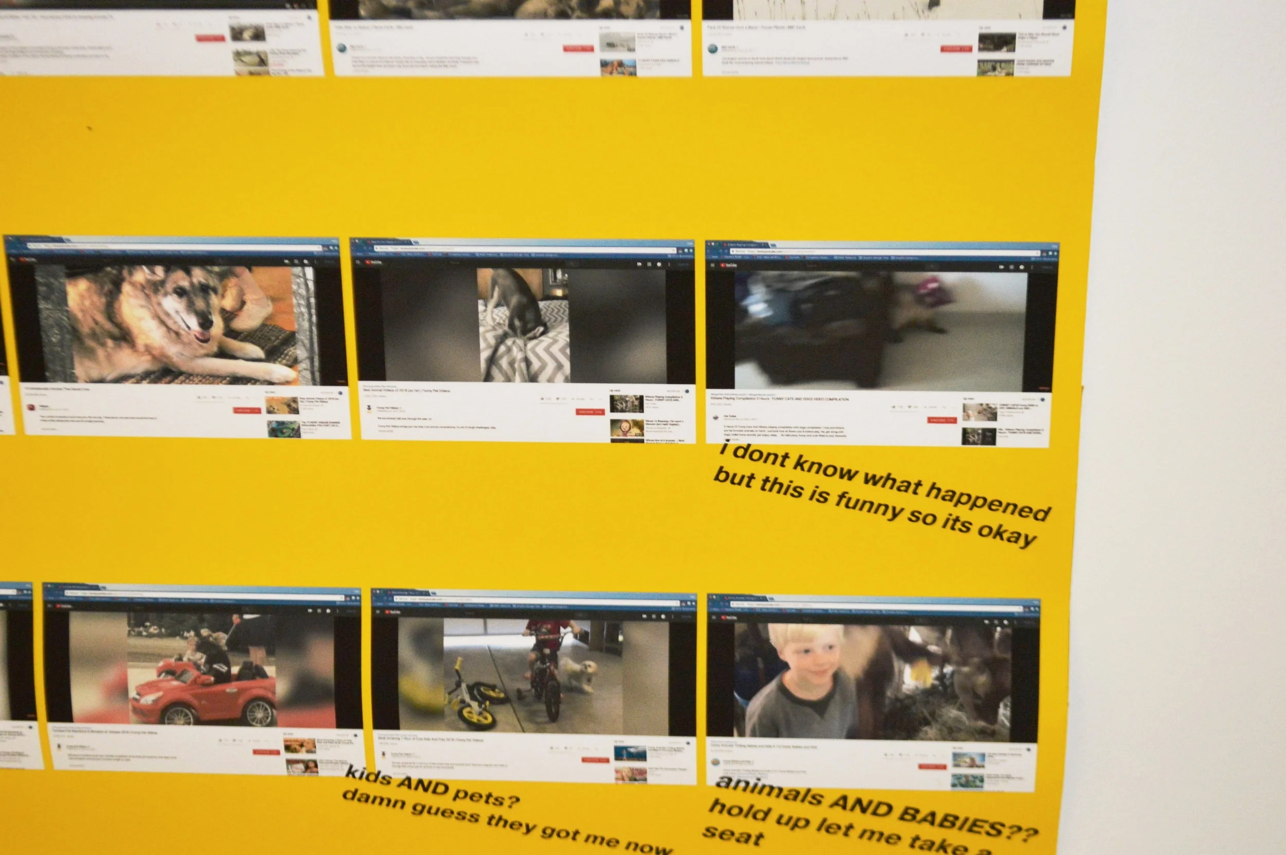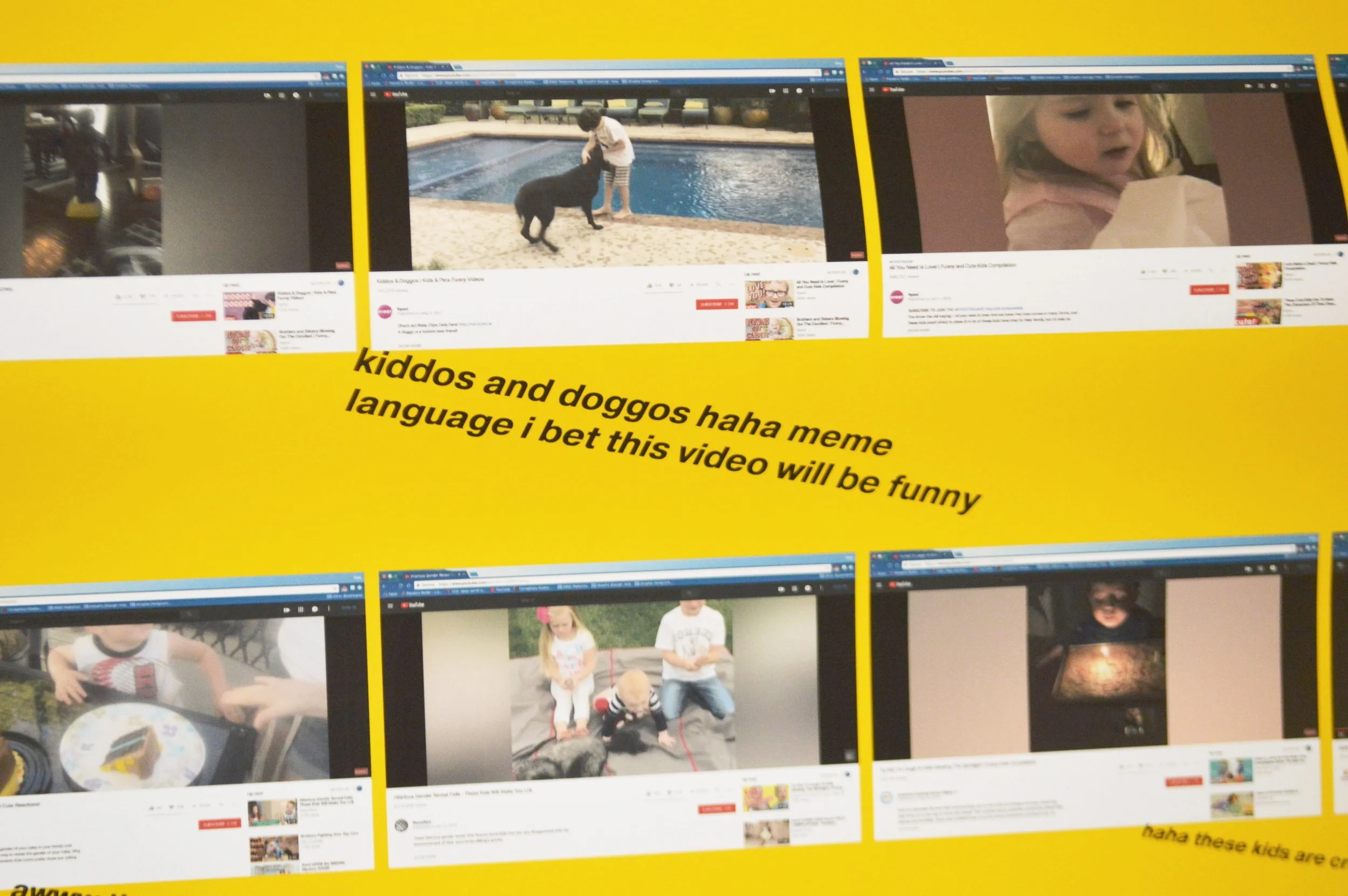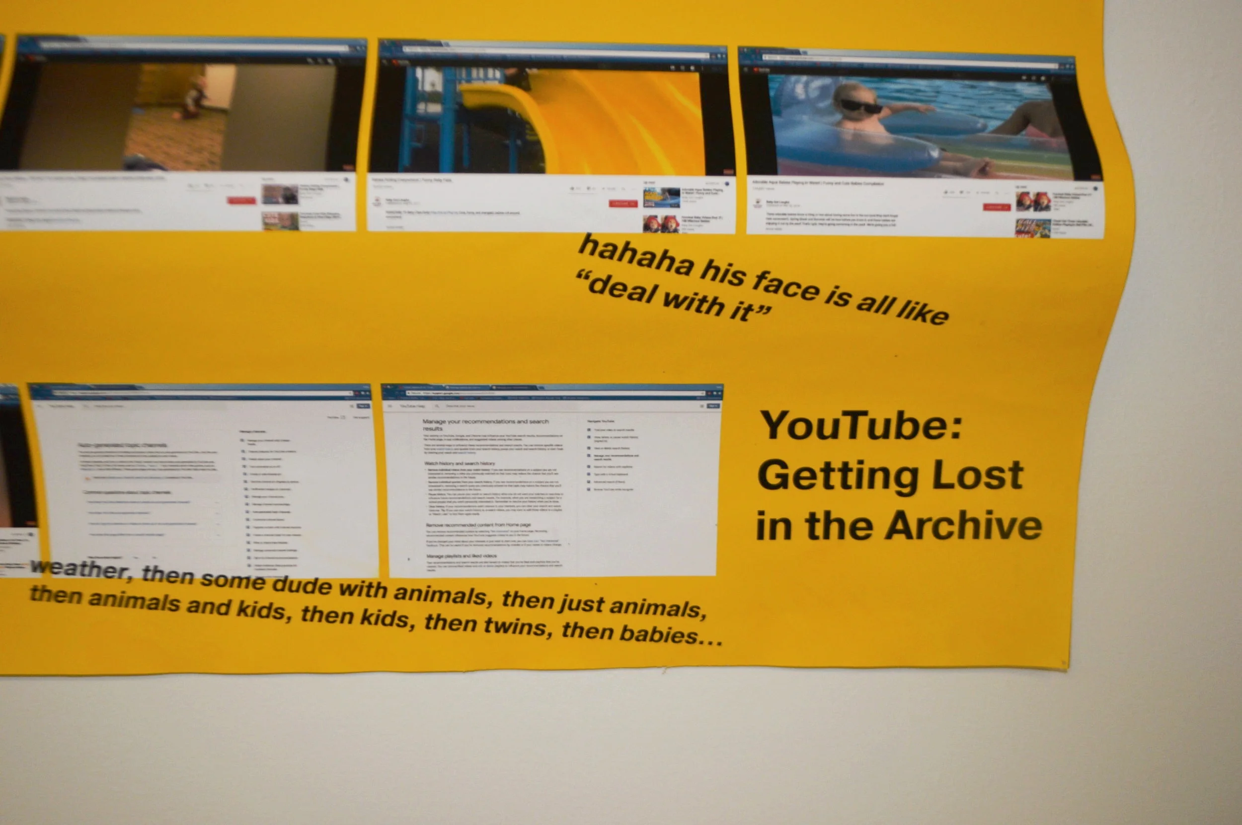 Youtube, as an archival system serves many purposes. It entertains, informs, teaches, and catalogs countless hours of media, of all genres imaginable. Despite its usefulness, it more often succeeds in distracting its viewers. they go to youtube with an original intent or purpose, and end up lost in the "mindless scroll" brought on by youtube's up next video function. Media is spoon fed to us automatically, and the content of what is given to us is tailored directly to our interests and what we are watching. AS soon as the video becomes our focus, we are presented with another, often drawing our attention away from the video we were watching and having us only remember a fraction of it. this project is as an attempt to exemplify that process in a new way, with a focus on the overwhelming feeling constantly absorbing videos over a seemingly "short" period of time.